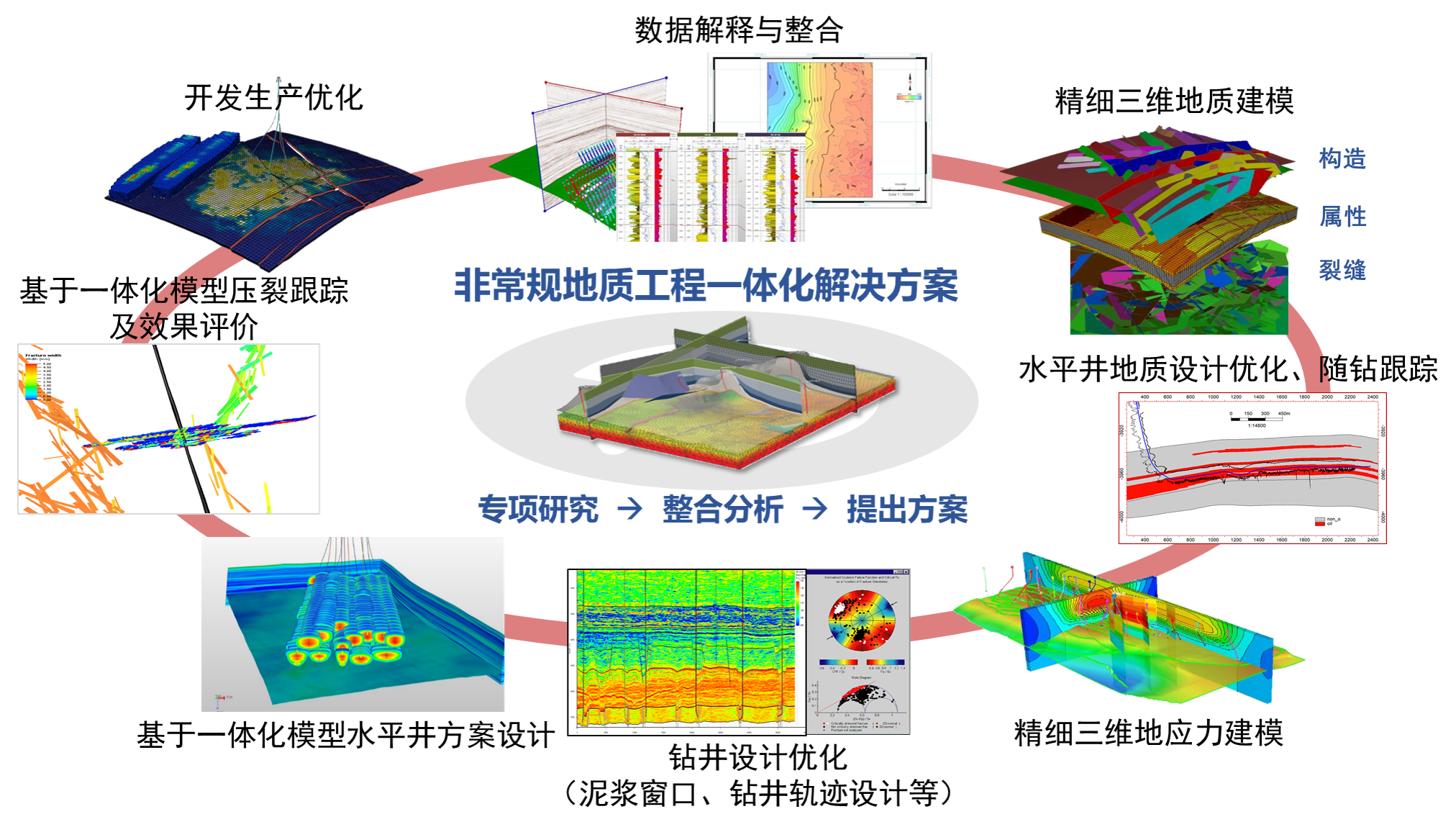 領(lǐng)先的頁(yè)巖油氣、致密油氣研究能力和一體化服務(wù)經(jīng)驗(yàn),主要服務(wù)能力包括:1)基于井震結(jié)合的水平井隨鉆跟蹤技術(shù),在三維地質(zhì)模型的基礎(chǔ)上完成地質(zhì)設(shè)計(jì)、隨鉆跟蹤調(diào)控及精細(xì)三維模型多次迭代調(diào)整。2)基于一體化模型鉆井安全設(shè)計(jì)技術(shù),在單井地應(yīng)力及三維地質(zhì)模型基礎(chǔ)上建立三維巖石力學(xué)模型及地層可鉆性模型,預(yù)測(cè)新鉆井不同坍塌壓力、地層壓力等。3)基于一體化模型壓裂服務(wù)技術(shù),在地質(zhì)、裂縫、地質(zhì)力學(xué)建模技術(shù)基礎(chǔ)上開(kāi)展壓前地質(zhì)風(fēng)險(xiǎn)預(yù)判及水平井方案優(yōu)化、壓中實(shí)時(shí)分析與優(yōu)化、壓后分析與總結(jié)。